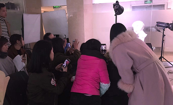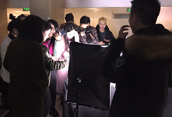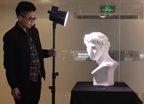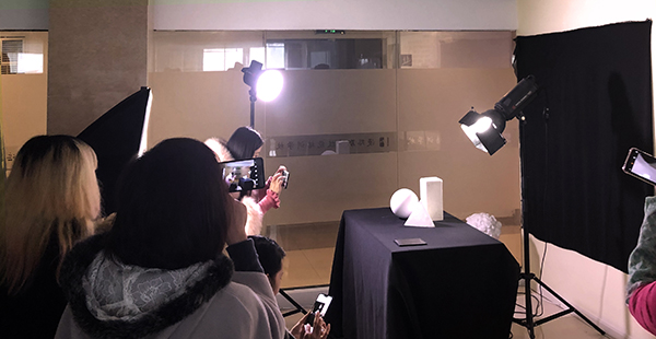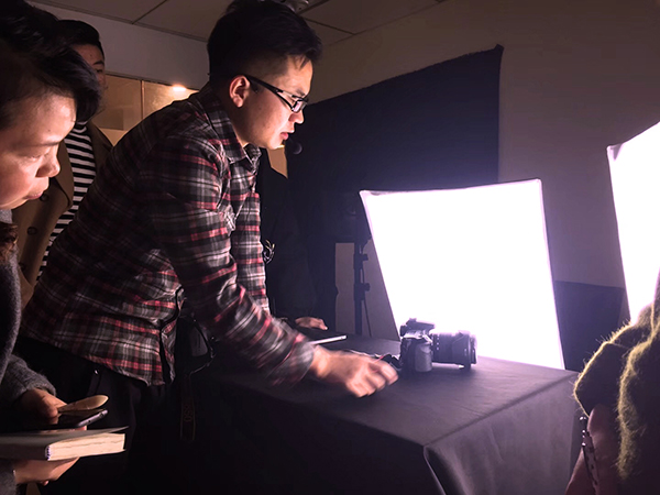 接下來(lái)就是進(jìn)入正題實(shí)踐的時(shí)候啦,莊老師傳授同學(xué)們室內(nèi)光線的運(yùn)用:主光源(照亮物體)、輔助燈(補(bǔ)充細(xì)節(jié))、背景燈(勾勒輪廓)的使用以及擺放。